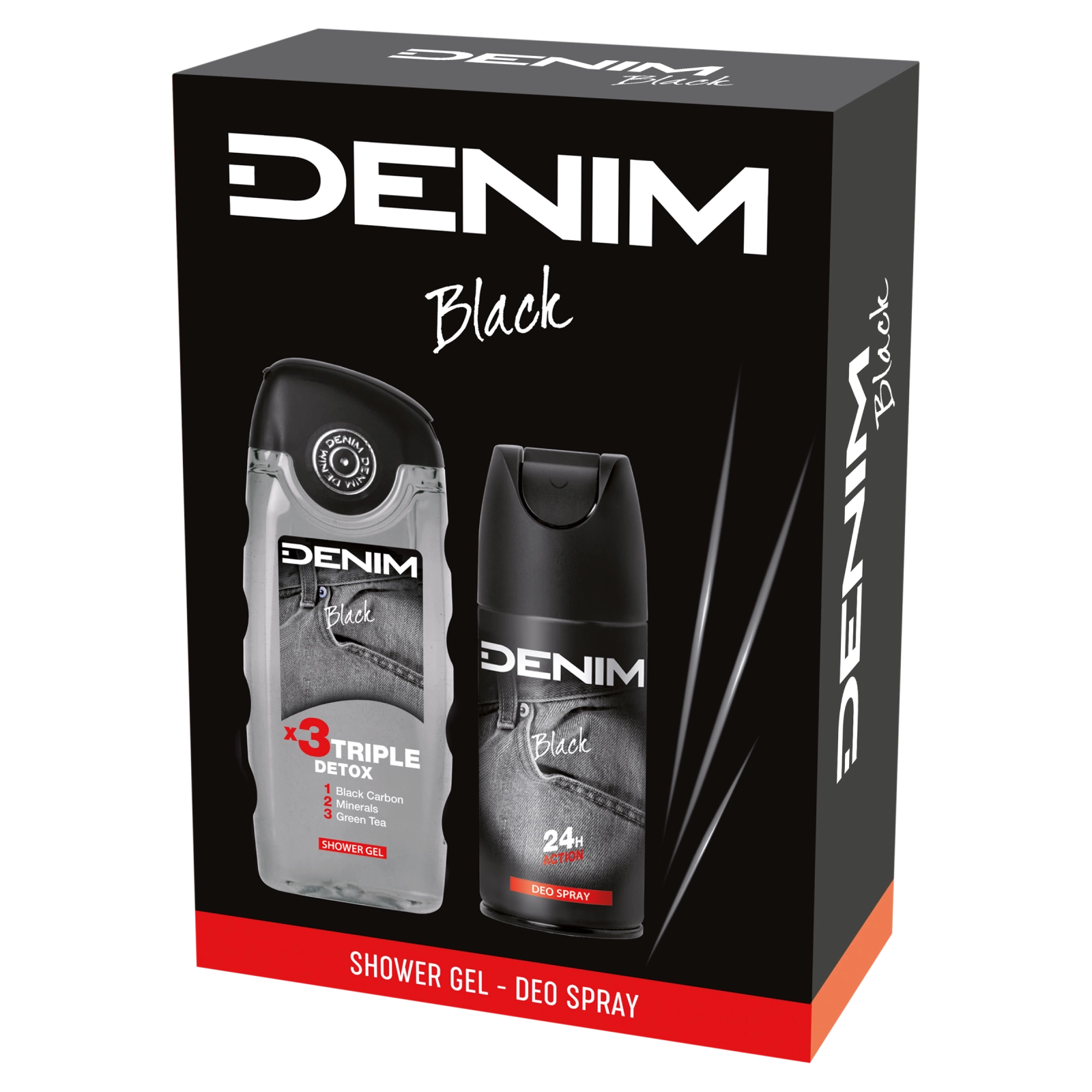 Denim Black tusfürdő: Aqua, Sodium Laureth Sulfate, Cocamidopropyl Betaine, Sodium Chloride, Parfum, Charcoal Powder, Maris Aqua, Camellia Sinensis Leaf Extract, Sorbitol, Glycerin, Polyquaternium-7, PEG-40 Hydrogenated Castor Oil, Tetrasodium Glutamate Diacetate, Sodium Lactate, Lactic Acid, Citric Acid, Phenoxyethanol, Sodium Benzoate, Methylchloroisothiazolinone, Methylisothiazolinone, Benzyl Salicylate, Coumarin, Linalool, Denim Black dezodor: Butane, Alcohol Denat., Propane, Parfum, Isobutane, Isopropyl Myristate, 2-Methyl 5-Cyclohexylpentanol, Benzyl Salicylate, Citronellol, Coumarin, Eugenol, Geraniol, Limonene, Linalool