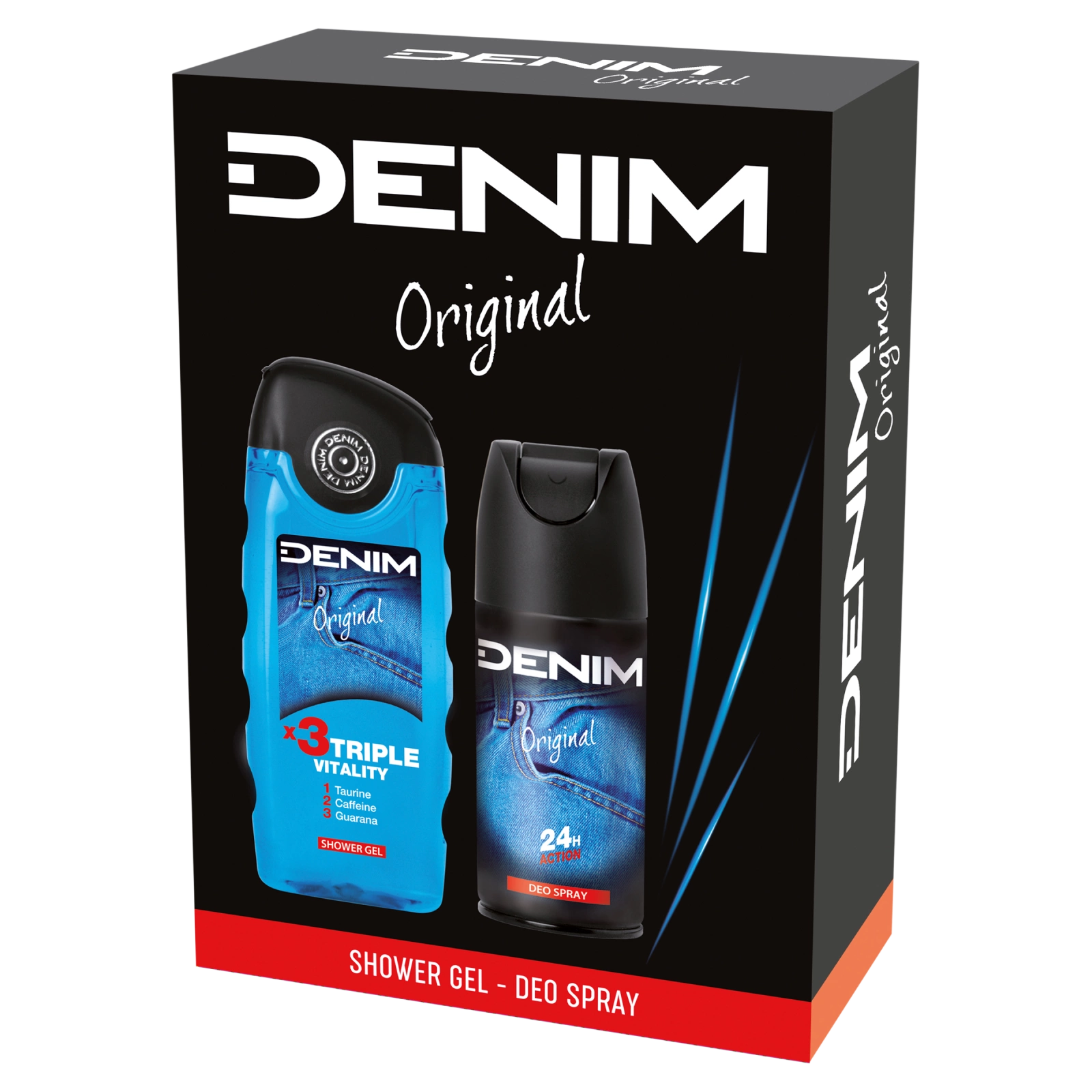 Denim Original tusfürdő: Aqua, Sodium Laureth Sulfate, Cocamidopropyl Betaine, Sodium Chloride, Parfum, Taurine, Caffeine, Paullinia Cupana Seed Extract, Sorbitol, Polyquaternium-7, PEG-40 Hydrogenated Castor Oil, Tetrasodium Glutamate Diacetate, Propylene Glycol, Sodium Lactate, Lactic Acid, Citric Acid, Sodium Benzoate, Methylchloroisothiazolinone, Methylisothiazolinone, Alpha-Isomethyl Ionone, Citronellol, Coumarin, Hexyl Cinnamal, Limonene, Linalool, Denim Original dezodor: Butane, Alcohol Denat., Propane, Isobutane, Parfum, Isopropyl Myristate, 2-Methyl 5-Cyclohexylpentanol, Alpha-Isomethyl Ionone, Citral, Citronellol, Coumarin, Eugenol, Geraniol, Hexyl Cinnamal, Limonene, Linalool